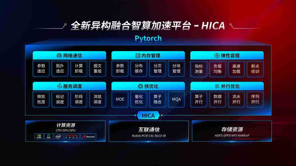 通过自研的服务层、、、中间适配层、、、以及调度编排算法,,,,采用数据并行、、、、模型并行等多种并行方式,,,,把并行计算任务进行有效的分解,,使其分别由相应的软件栈和算力资源来承接。。。当GPU资源变化,,HICA可以实时动态调度计算子任务并调整模型拓扑和架构,,,,以充分聚合各种算力资源。。。。