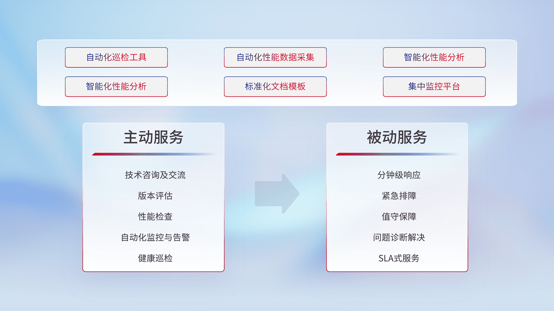 智能化工具和标准化文档,,,保障服务质量,,,提供主动服务(包含技术咨询、、、、版本评估、、性能检查、、、自动化监控与告警、、、健康巡检)和被动服务包含(分钟级响应、、紧急排障、、值守保障、、问题诊断解决、、、、SLA服务)。。。